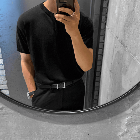BLACK VERTICAL KNITTED SHORT SLEEVE COLLAR SHIRT